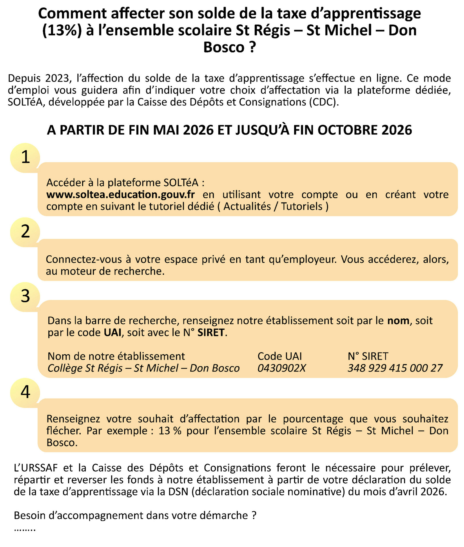 Toutefois, les entreprises continuent de choisir à quelles écoles verser leur taxe et peuvent choisir plusieurs bénéficiaires. Notre établissement peut bénéficier de la taxe d’apprentissage. Depuis mai 2023, pour affecter le solde de la taxe d’apprentissage (appelé également le 13%) à notre établissement St Régis - St Michel, il faut utiliser la plateforme SOLTéA. http://www.soltea.education.gouv.fr Pour créer votre compte, un tutoriel est à votre disposition : https://www.soltea.education.gouv.fr/espace-public/aide/tutoriels-video-fonctionnement-plateforme#tuto1